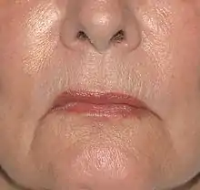 Angular cheilitis is a fairly non specific term which describes the presence of an inflammatory lesion in a particular anatomic site (i.e. the corner of the mouth). As there are different possible causes and contributing factors from one person to the next, the appearance of the lesion is somewhat variable. The lesions are more commonly symmetrically present on both sides of the mouth,[4] but sometimes only one side may be affected. In some cases, the lesion may be confined to the mucosa of the lips, and in other cases the lesion may extend past the vermilion border (the edge where the lining on the lips becomes the skin on the face) onto the facial skin. Initially, the corners of the mouth develop a gray-white thickening and adjacent erythema (redness).[2] Later, the usual appearance is a roughly triangular area of erythema, edema (swelling) and breakdown of skin at either corner of the mouth.[2][4] The mucosa of the lip may become fissured (cracked), crusted, ulcerated or atrophied.[2][4] There is not usually any bleeding.[7] Where the skin is involved, there may be radiating rhagades (linear fissures) from the corner of the mouth. Infrequently, the dermatitis (which may resemble eczema) can extend from the corner of the mouth to the skin of the cheek or chin.[4] If Staphylococcus aureus is involved, the lesion may show golden yellow crusts.[8] In chronic angular cheilitis, there may be suppuration (pus formation), exfoliation (scaling) and formation of granulation tissue.[2][4]
