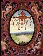 The Gouache painting (opposite) was probably painted in 1603 and appears in the Albums de Croÿ. It is part of a wide range of topographical paintings made at the request of the Duke of Croy: an oval with a bird's-eye view of the landscape is framed in the four corners by four naked male figures with those at the top facing and the lower ones facing to the rear. The oval medallion contains a cartouche with the name of the village over a representation of the landscape seen from the south in late summer (see the plowed field and leaves on the trees).
