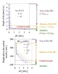The annular fluidized bed is a new type of fluidized bed that has a specific type of motion where it moves in radial. There is relatively little axial mixing of gases and there is radial motion. The axial flow profile of the annular fluidized bed can be determined by pressure drops along the plant height, which can be divided into three major parts: the annulus, the bottom and the top part of the mixing chamber. Based on the height of the bed, while the annulus has a porosity close to the solids minimal fluidization porosity, each region of bed is characterized by different pressure gradients. The closer to the central nozzle, the lower the pressure gradient and the higher the pressure drop in the mixing chamber. With known pressure gradient (ΔP/ΔH), the solid concentration can be calculated using Wirth equation shown below: