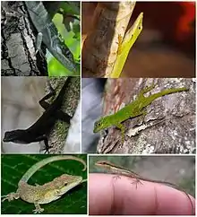 Anoles have repeatedly evolved into similar forms on different islands, dubbed 'ecomorphs'. Convergence is in microhabitat specialty, behavior, and morphology.[3] Langerhans, Knouft & Losos call the set of Anolis lizard ecomorphs of the Greater Antilles "a classic example of convergent evolution."[4][5] Jonathan Losos defined six Anolis ecomorphs according to the predominant microhabitat (e.g. grasses, open ground, different parts of trees) of the respective Anolis: crown giant, trunk-crown, trunk, trunk-ground, twig, and grass-bush.[5][6]