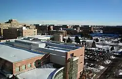 The Anschutz campus hosts administrative and teaching functions, as well as clinical and research programs with nearly 25,000 faculty, employees, and support staff.[43] The principal buildings on campus include the Fitzsimons Building (formerly Building 500), two Research Complex towers, two education buildings, the Fulginiti Pavilion for Bioethics and Humanities, the Barbara Davis Diabetes Center, the Nighthorse Campbell Native Health Building, Strauss Health Sciences Library, the Anschutz Health and Wellness Center, as well as the individual buildings for the Skaggs School of Pharmacy and Pharmaceutical Sciences, and the School of Dental Medicine. The Children's Hospital and the University of Colorado Hospital are located to the south of the campus.[44] The north part of campus consists of two bioscience buildings, which includes the Gates Biomanufacturing Facility.[45]