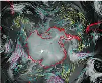 The AMRC updated its composite satellite imagery in 2014 which are derived from tests of atmospheric motion vectors. Currently, geostationary and polar-orbiting satellite observations can be used to generate wind vectors based on cloud motions or water vapor target movements over a series of three satellite images. However, the paths of the geostationary and polar-orbiting satellites leave a band of high latitudes not covered near the Antarctic and Southern Ocean. The AMRC generated atmospheric motion vectors to fill in these ‘rings’ of missing derived wind vectors.[2]