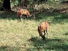 Many antelope are sexually dimorphic. In most species, both sexes have horns, but those of males tend to be larger. Males tend to be larger than the females, but exceptions in which the females tend to be heavier than the males include the bush duiker, dwarf antelope, Cape grysbok, and oribi, all rather small species. A number of species have hornless females (e.g., sitatunga, red lechwe, and suni). In some species, the males and females have differently coloured pelages (e.g. blackbuck and nyala).