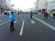 A pro-government counter protest reportedly gathered 10,000 people on 25 November.[3] The Party of Regions allegedly paid UAH₴100 to its supporters to participate in a three-hour rally, with supporters calling for "building Europe in Ukraine [...] but on terms and conditions favourable for Ukraine".[4] According to the Kyiv Post, demonstrators held anti-EU and homophobic banners.[5] On 29 November a 2-hour 3,000 people strong pro-government rally took place on European Square.[6][7] Party of Regions member of parliament Vladyslav Lukianov told the crowd: "I'm sure that our movement to Europe will never change. We support this choice. Let the land shatter from our steps. Together we will win".[6][8] The Kyiv Post again reported incentives were given to attend and described attendants in appearance "to be homeless; still more look drunk. The crowd consists mostly of men".[6] Euronews spoke of many being "bused in from the east of the country where pro-Russian sentiment is strong. They, too, carried national flags as well as those of the ruling Party of Regions".[9] Many in the crowd refused to talk to Euronews.[10]