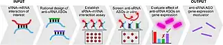 Antisense small RNA can also be engineered and utilized by scientists to perform experimental functions. [20] In synthetic biology, employing non-coding RNA such as antisense small RNA has advantages for creating regulatory architecture within engineering systems, provided the ability to predict function using the strand sequence.[20] In experiments, engineered riboregulators, which are specific RNA that respond to signal RNA through complementary base pairing utilizing anti-small RNA, have been found to be capable of activating independent gene expression.[20] Development of RNA array-based interaction assays that allow for screening in vitro have further advanced platforms targeting gene expression with antisense small RNAs. [19][21] RNA-array based interaction assays screen for synthetic antisense small RNA interactions in vitro, through a surface-capture technique. [19][21] An array of immobilized double-stranded DNA template for antisense small RNA sits opposite to an RNA-capture surface composed of possible antisense small RNA targets, separated by a solution of transcription reagents. [19][21] Captured RNA are visualized using fluorescent staining, which can indicate whether a prospective antisense small RNA has been bound to its target. [19][21]