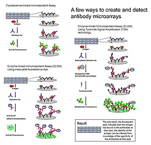 An antibody microarray (also known as antibody array) is a specific form of protein microarray. In this technology, a collection of captured antibodies are spotted and fixed on a solid surface such as glass, plastic, membrane, or silicon chip, and the interaction between the antibody and its target antigen is detected. Antibody microarrays are often used for detecting protein expression from various biofluids including serum, plasma and cell or tissue lysates. Antibody arrays may be used for both basic research and medical and diagnostic applications.[1][2][3][4]