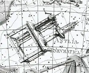 The French astronomer Nicolas-Louis de Lacaille first described the constellation in French as la Machine Pneumatique (the Pneumatic Machine) in 1751–52,[3][4] commemorating the air pump invented by the French physicist Denis Papin.[5] De Lacaille had observed and catalogued almost 10,000 southern stars during a two-year stay at the Cape of Good Hope, devising fourteen new constellations in uncharted regions of the Southern Celestial Hemisphere not visible from Europe. He named all but one in honour of instruments that symbolised the Age of Enlightenment.[lower-alpha 1][6] Lacaille depicted Antlia as a single-cylinder vacuum pump used in Papin's initial experiments, while German astronomer Johann Bode chose the more advanced double-cylinder version.[5] Lacaille Latinised the name to Antlia pneumatica on his 1763 chart. English astronomer John Herschel proposed shrinking the name to one word in 1844, noting that Lacaille himself had abbreviated his constellations thus on occasion.[7] This was universally adopted.[8] The International Astronomical Union adopted it as one of the 88 modern constellations in 1922.[9]