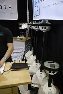 Applications include marketing,[4] remote experts, a remote lobby service (where receptionists can remotely ‘bot in’ to greet and guide clients), museum guides, education, and translation services in airports and public spaces, remote property tours provided to foreign clients by real estate agents (engendering trust in that the client can drive them-self around), mobile exhibition attendants and security patrols, as well as the more mundane business meeting presence.