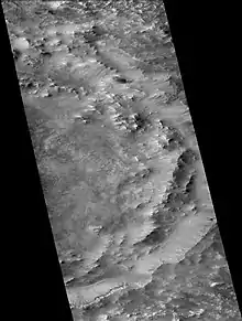 As for the next theory, much of the surface of Mars is covered by a thick smooth mantle that is thought to be a mixture of ice and dust.[11][12][13] This ice-rich mantle, a few yards thick, smooths the land, but in places it has a bumpy texture, resembling the surface of a basketball. The mantle may be like a glacier and under certain conditions the ice that is mixed in the mantle could melt and flow down the slopes and make gullies.[14][15] Because there are few craters on this mantle, the mantle is relatively young. The ice-rich mantle may be the result of climate changes.[16] Changes in Mars's orbit and tilt cause significant changes in the distribution of water ice from polar regions down to latitudes equivalent to Texas. During certain climate periods water vapor leaves polar ice and enters the atmosphere. The water comes back to ground at lower latitudes as deposits of frost or snow mixed generously with dust. The atmosphere of Mars contains a great deal of fine dust particles. Water vapor will condense on the particles, then fall down to the ground due to the additional weight of the water coating. When Mars is at its greatest tilt or obliquity, up to 2 cm of ice could be removed from the summer ice cap and deposited at midlatitudes. This movement of water could last for several thousand years and create a snow layer of up to around 10 meters thick.[17][18] When ice at the top of the mantling layer goes back into the atmosphere, it leaves behind dust, which insulating the remaining ice.[19] Measurements of altitudes and slopes of gullies support the idea that snowpacks or glaciers are associated with gullies. Steeper slopes have more shade which would preserve snow.[5]