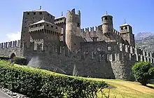 There are numerous medieval castles and fortified houses in the Aosta Valley, including Châtel-Argent, Saint-Pierre Castle, Fénis Castle, Issogne Castle, Ussel Castle, Sarre Castle, Cly Castle, Verrès Castle, and Châtelard Castle.[26] Savoy Castle in Gressoney-Saint-Jean was conceived in the 19th century and completed in 1904.[26] Since 1990, it has also been home to the Savoy Castle Alpine Botanical Garden.