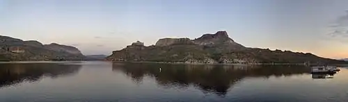 Apache Lake is formed by Horse Mesa Dam impounded the Salt River, which was completed in 1927. The second largest of the four Salt River Project reservoirs, Apache Lake is located about 5 miles (8 km) downstream from Theodore Roosevelt Lake (the largest), and upstream from Canyon Lake and Saguaro Lake.