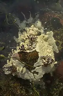 Aplousobranchia is an order of sea squirts in the class Ascidiacea, first described by Fernando Lahille in 1886.[1][2] They are colonial animals, and are distinguished from other sea squirts by the presence of relatively simple pharyngeal baskets. This provides the etymology of their name: in ancient greek, ἁ.πλοος-ους (ha.ploos-ous) means "simple". The posterior part of the abdomen contains the heart and gonads, and is typically larger than in other sea squirts.