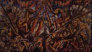 The diptych is oil on 2-piece canvas measuring 2.75 X 4.50 meters (9 X 15 feet).[2] It depicts two horsemen or as one writer describes "Two wild Knights riding toward each other in an explosion swarming the canvas.[3] They represent the Apocalypse Riders who are also the riders of the war in Lebanon, the artist’s native country."[4]