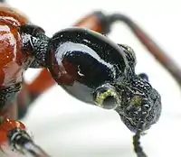 Apoderus coryli can reach a length of 6–8 millimetres (0.24–0.31 in).[4] These primitive weevils have a red shiny bell-shaped pronotum, a shiny black or dark brown head with protruding eyes, a distinct neck and short and rounded elytra. Their straight antennae are inserted near the base of the rostrum. The prothorax is much narrower than the base of the elytra on the abdomen. The scutellum is broad, triangular to trapezoidal and without stripes. The legs are red at the base, black towards the end.[4][5]