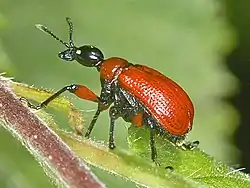 Apoderus coryli, common name hazel-leaf roller weevil, is a species of leaf-rolling beetles belonging to the family Attelabidae subfamily Attelabinae.[1] Because of the trunk-like elongated head, it is often mistakenly attributed to the weevils.[2]