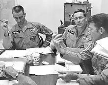 Throughout the Mercury and Gemini programs, McDonnell Aircraft engineer Guenter Wendt led the spacecraft launch pad teams, with ultimate responsibility for condition of the spacecraft at launch. He earned the astronauts' respect and admiration, including Schirra's.[36] However, the spacecraft contractor had changed from McDonnell (Mercury and Gemini) to North American (Apollo), so Wendt was not the pad leader for Apollo 1.[37] So adamant was Schirra in his desire to have Wendt back as pad leader for his Apollo flight, that he got his boss Slayton to persuade North American management to hire Wendt away from McDonnell, and Schirra personally lobbied North American's launch operations manager to change Wendt's shift from midnight to day so he could be pad leader for Apollo 7. Wendt remained as pad leader for the entire Apollo program.[37] When he departed the spacecraft area as the pad was evacuated prior to launch, after Cunningham said, "I think Guenter's going", Eisele responded "Yes, I think Guenter went."[lower-alpha 2][38][39][40][41]