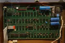 The Apple I's built-in computer terminal circuitry with TV composite output used shift registers and a character generator. All one needed was a television set and a ASCII keyboard. The Apple 1 did not come with a case. It was either used as-is or some chose to build custom (mostly wooden) cases.[25] Competing machines such as the Altair 8800 generally were programmed with front-mounted toggle switches and used indicator lights (red LEDs, most commonly) for output, and had to be extended with separate hardware to allow connection to a computer terminal or a teletypewriter machine. This made the Apple I, along with earlier introduced Sphere 1 and other hobbyist microcomputers, an innovative machine for its day.