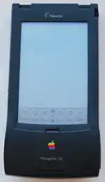 The Newton is a series of personal digital assistants (PDAs) developed and marketed by Apple Computer, Inc. An early device in the PDA category (the Newton originated the term),[3] it was the first to feature handwriting recognition. Apple started developing the platform in 1987 and shipped the first devices in August 1993. Production officially ended on February 27, 1998. Newton devices ran on a proprietary operating system, Newton OS; examples include Apple's MessagePad series and the eMate 300, and other companies also released devices running on Newton OS. Most Newton devices were based on the ARM 610 RISC processor and all featured handwriting-based input.