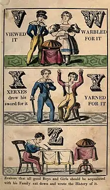 Variations in wording began to appear with the start of the 19th century. The History of the APPLE PIE, an Alphabet for little Masters and Misses, ‘written by Z’ (London 1808), has "B bit it, C cried for it, D danced for it, E eyed it, F fiddled for it, G gobbled it, H hid it, I inspected it, J jumped over it, K kicked it, L laughed at it, M mourned for it, N nodded for it, O opened it, P peeped into it, Q quaked for it, R rode for it, S skipped for it, T took it, U upset it, V viewed it, W warbled for it, X Xerxes drew his sword for it, Y yawned for it, Z zealous that all good boys and girls should be acquainted with his family, sat down and wrote the history of it". There are two American versions in the Beinecke Rare Book & Manuscript Library;[3] a slightly different English version from 1835 is archived in the Open Library[4] The most popular illustrated later edition of the rhyme was Kate Greenaway’s A Apple Pie: An Old-Fashioned Alphabet Book (London, 1886),[5] which has been continuously reprinted up to the present. In place of the plaintive yearning for a piece of the pie with which the original version ends, she substitutes the more fulfilled "UVWXYZ all had a large slice and went off to bed", so allowing herself to get away with only twenty illustrations.