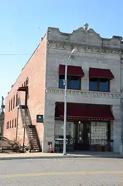 The Applegate Drugstore is a historic commercial building at 116 South First Street in Rogers, Arkansas. It is a two-story masonry building, with brick sidewalls and a limestone facade. Pilasters of alternating rough and smooth stone delineate the first floor elements of the storefront, rising to a freeze and dentillated ogee course between the floors. The second floor has two large bays, each with a pair of sash windows, delineated by Corinthian pilasters. The interior of the store retains original drugstore furnishings, including a pressed tin ceiling, tile floor, walnut shelving, and a polished marble fountain counter. The building was constructed in 1906 to house the drugstore of J.E. Applegate, and has housed similar retail operations since then. The building has one of Rogers' best-preserved early-20th century commercial interiors.[2]