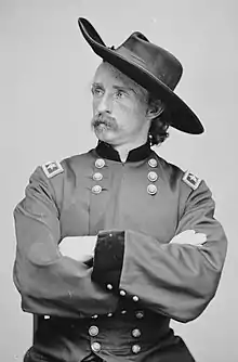 At about 5 p.m., on March 29, two of Sheridan's divisions, the First commanded by Brigadier General Thomas Devin and, the Second, detached from the Army of the Potomac, commanded by Major General George Crook entered Dinwiddie Court House.[47] Sheridan posted guards at the roads entering the town for protection from Confederate patrols.[47] Sheridan's Third Division commanded by Brigadier General (Brevet Major General) George Armstrong Custer was 7 miles (11 km) behind Sheridan's main force protecting the bogged down wagon trains.[47][83] The First and Third Divisions were still under the direct command of Brigadier General (Brevet Major General) Wesley Merritt as an unofficial cavalry corps commander of the still existing Army of the Shenandoah.[48]