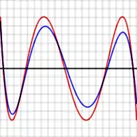 Error between optimal polynomial and exp(x) (red), and Chebyshev approximation and exp(x) (blue) over the interval [−1, 1]. Vertical divisions are 10−4. Maximum error for the optimal polynomial is 5.47 × 10−4.
