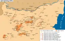 The April Uprising (Bulgarian: Априлско въстание, romanized: Aprilsko vastanie) was an insurrection organised by the Bulgarians in the Ottoman Empire from April to May 1876. The rebellion was suppressed by irregular Ottoman bashi-bazouk units that engaged in indiscriminate slaughter of both rebels and non-combatants (see Batak massacre).