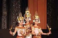 Apsaras represent an important motif in the stone bas-reliefs of the Angkorian temples in Cambodia (8th–13th centuries AD), however, not all female images are considered to be apsaras. In harmony with the Indian association of dance with apsaras, Khmer female figures that are dancing or are poised to dance are considered apsaras; female figures, depicted individually or in groups, who are standing still and facing forward in the manner of temple guardians or custodians are called devatas.[8]