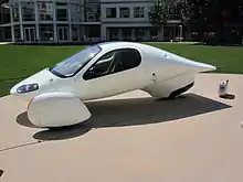 The Aptera 2 Series was to be a two-seat, three-wheeled passenger vehicle. It was planned to be available in both all-electric (2e) and series hybrid (2h) configurations, at prices ranging from mid-twenty to mid-forty thousand dollars.[66] By mid-2008, aerodynamic optimization using simulations and light-weight composite construction yielded a prototype which allegedly consumed only 80 Wh/mi (watt hours per mile) (50 Wh/km) at 55 mph (89 km/h), less than half the energy needed to propel either the EV1 or any existing Tesla .[67] The April 14, 2010 press release revised the design-intent vehicle-efficiency estimate to about 200 Wh/mi (125 Wh/km), 100-mile (160 km) range from a full 20 kWh battery pack, or around 200 mpg‑US (1.2 L/100 km) equivalent.[50] On the hybrid vehicle, it led to projections of 130 miles per US gallon (1.8 L/100 km) on gasoline alone, or 300 mpg‑US (0.78 L/100 km) if plugged in every 120 miles (190 km). Since then, the vehicle underwent a series of redesigns, including the addition of side mirrors and expansion of the interior space, however, retaining its three-wheel configuration and its aerodynamic teardrop shape. At the Automotive X-Prize, the entered prototype had a tested efficiency of 200 MPGe.
