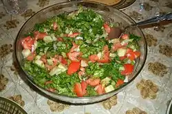 A recipe for Arab salad in Woman's Day magazine includes diced tomato, cucumber and onion.[4] Often mixed with parsley and combined with the juice of freshly squeezed lemon and olive oil, Arabic salad contains no lettuce. All the vegetables, except the onion, are left unpeeled, and the salad should be served immediately. Other variations include serving with fried pita slices or adding sumac to the lemon and oil dressing.[5] Among Palestinians, this Arabic salad is known as Salatat al-Bundura ("tomato salad") and is popularly served alongside rice dishes.[6][7]