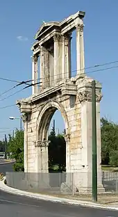 The Arch of Hadrian (Greek: Αψίδα του Αδριανού, romanized: Apsida tou Adrianou), most commonly known in Greek as Hadrian's Gate (Greek: Πύλη του Αδριανού, romanized: Pyli tou Adrianou), is a monumental gateway resembling—in some respects—a Roman triumphal arch. It spanned an ancient road from the center of Athens, Greece, to the complex of structures on the eastern side of the city that included the Temple of Olympian Zeus.
