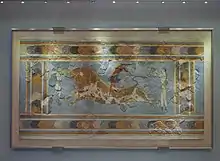 Palaces of the Minoan period were multi-functional; they were the religious, economic and political administrative centres for the whole of the Minoan society.[13] Basic palace structures consisted of a Central court, which was the main focus of the palace, where most theatrical and political events took place.[14] The Central court is also believed to be the room where the cultural or religious activity of bull-leaping, which is depicted in the Bull-leaping Fresco located in the Palace of Knossos on Crete, took place.[14] Other rooms within the basic palace structure consisted of residential quarters, workshops and crafts rooms, storerooms for surplus foodstuffs, and rooms for religious practice.[13]