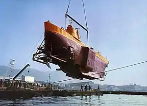 Archimède was christened on 27 July 1961, at the French Navy base of Toulon. It was designed to go beyond 30,000 feet (9,100 m),[8] and displaced 61 tons.[9] In October 1961, Archimède passed its first dive tests, diving to 5,000 feet (1,500 m) unmanned.[10] On 27 November 1961, Archimède achieved a speed of 3 knots (5.6 km/h; 3.5 mph), over a distance of 4.5 miles (7.2 km) at a depth of 7,870 feet (2,400 m) in the Mediterranean Sea.[11]