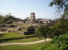 The Maya appear to have founded Lakam Ha about 100 B.C., during the Formative period (2500 B.C. – 300 A.D.),[2] predominantly as a farmers' village favored by the numerous springs and streams nearby. The population of Lakam Ha grew during the Early Classic period (200–600) as it became a full-fledged city; during the Late Classic period (600–900) it was made the capital of the B'akaal ('bone') region in Chiapas and Tabasco. The oldest of the structures that have been discovered were built around the year 600.
