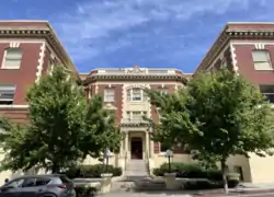 Some of Spokane's high schools and educational institutions are historic buildings and notable for their architecture. The first and one of the most striking is the Collegiate Gothic style Lewis and Clark High School designed by Loren Rand.[30] Built in 1910 and 1911, Rand is said to have worked passionately on the project and dedicated an unusual amount of time on research, especially for the architectural embellishments which featured a clock tower and an entryway evoking elements of a European Gothic cathedral.[31] Lewis and Clark High School was listed on the National Register of Historic Places (NRHP) in 2001 following a renovation and expansion. Also listed on the NRHP following a 2009 renovation and expansion is John R. Rogers High School, built in 1932 and designed by John Dow in Art Deco, a rarely used style for a high school, it features zigzags, chevrons, and vegetation etched on its exterior walls.[32] During the years when modernist architecture was flourishing in the city, two high schools were constructed, Shadle Park High School and Joel E. Ferris High School. Shadle Park High School was built in 1957 well after the modernist movement had caught on nationwide and started peaking in the 1950s; as the first school to be constructed in this new forward-thinking, modern style, the high school was highly anticipated to be a bold statement that the city had entered a new era.[33] The architect chosen for the design of the school was Culler, Gale, Martell & Norrie, a local firm that specialized in modern institutional buildings that was affiliated with Perkins and Will out of Chicago.[33] In high contrast to the past high schools made of brick and mortar with symmetric layouts, Shadle Park High School was clad in a concrete and multi-tiered, asymmetrical glass façade and incorporated glass curtain walls and a variety of construction media including composite materials and on the interior it featured an asymmetrical hallway layout with shiny aluminum door frames and stair railings.[33] As a showcase for modern construction, architecture, and education, the $3 million cost of the building was reportedly the most expensive project undertaken in city history.[33] Shadle Park completed a renovation and expansion in 2008, which preserved its appearance and modernized it for the future. The last high school to be built in the city was Ferris High School in 1963. The design is most notable for its open air campus, with buildings connected via breezeways, a concept that was popular in California at the time but was highly unusual for the area and a problematic choice given Spokane's harsh winters.[34] The high school was renovated in 2013 by NAC Architecture, tearing down all but the original Moritz Kundig designed auditorium and a gym that was added in 2007 to create a single wheel-and-spoke looking structure linking the existing buildings with classroom "wings" surrounded by a central mall.[35][36]