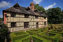 A good example of box framing is of this is Plas yn Pentre at Trevor near Wrexham. On the dissolution of the abbey in 1536 it came into the possession of the High Sheriff of Denbighshire, Ieuan Edwards. His grandson partially re-built the house in 1634. His initials and the date can be seen carved into the exterior of the west gable.[45]
