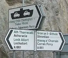 Donaldson[3] identifies "Buarblaig" (now referred to as Bourblaige, about 5 miles (8 kilometres) east of Kilchoan on the other side of Ben Hiant, grid reference NM546623[4]) with Muribulg, where the Annals of Tigernach record a battle between the Picts and the Dalriads in 731.[3] It may also be the 'Muirbole Paradisi' mentioned by Adomnán.[4] Although its stone foundations still remain, the village of Bourblaige no longer exists, as it was destroyed in the Highland Clearances in the early 19th century.[5]
