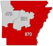 Area code 870 is a telephone area code in the North American Numbering Plan (NANP) for southern, eastern, and most of northern Arkansas. It was created on April 14, 1997 in a split from area code 501, Arkansas's original area code of 1947.