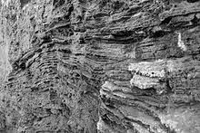 Arenite (Latin: arena, "sand")[1] is a sedimentary clastic rock with sand grain size between 0.0625 mm (0.00246 in) and 2 mm (0.08 in) and contain less than 15% matrix.[2] The related adjective is arenaceous. The equivalent Greek-derived term is psammite, though this is more commonly used for metamorphosed sediments.