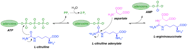 In the first step of the catalyzed reaction, citrulline attacks the α-phosphate of ATP to form citrulline adenylate, a reactive intermediate. The attachment of AMP to the ureido (urea-like) group on citrulline activates the carbonyl center for subsequent nucleophilic attack. This activation facilitates the second step, in which the α-amino group of aspartate attacks the ureido group. Attack by aspartate is the rate-limiting step of the reaction. This step produces free AMP and L-argininosuccinate.[3]