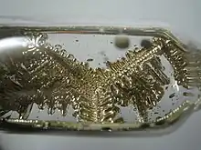 Argon was first isolated from air in 1894 by Lord Rayleigh and Sir William Ramsay at University College London by removing oxygen, carbon dioxide, water, and nitrogen from a sample of clean air.[16][17][18] They first accomplished this by replicating an experiment of Henry Cavendish's. They trapped a mixture of atmospheric air with additional oxygen in a test-tube (A) upside-down over a large quantity of dilute alkali solution (B), which in Cavendish's original experiment was potassium hydroxide,[15] and conveyed a current through wires insulated by U-shaped glass tubes (CC) which sealed around the platinum wire electrodes, leaving the ends of the wires (DD) exposed to the gas and insulated from the alkali solution. The arc was powered by a battery of five Grove cells and a Ruhmkorff coil of medium size. The alkali absorbed the oxides of nitrogen produced by the arc and also carbon dioxide. They operated the arc until no more reduction of volume of the gas could be seen for at least an hour or two and the spectral lines of nitrogen disappeared when the gas was examined. The remaining oxygen was reacted with alkaline pyrogallate to leave behind an apparently non-reactive gas which they called argon.