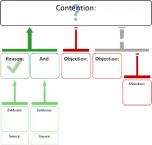 An argument map or argument diagram is a visual representation of the structure of an argument. An argument map typically includes the key components of the argument, traditionally called the conclusion and the premises, also called contention and reasons.[1] Argument maps can also show co-premises, objections, counterarguments, rebuttals, and lemmas. There are different styles of argument map but they are often functionally equivalent and represent an argument's individual claims and the relationships between them.