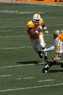 His junior season saw Foster take over as the main running back.[38] In the regular season opener against #12 California, he had 13 carries for 89 rushing yards to go along with three receptions for 20 receiving yards and a receiving touchdown in the 45–31 loss.[39] In the second game, against the Southern Miss Golden Eagles, he had 125 rushing yards and two rushing touchdowns in the 39–19 victory at home.[40] Against the #3 Florida Gators at the Swamp, Foster fumbled a left-handed hand-off from injured quarterback Erik Ainge which was recovered by Gators linebacker Dustin Doe and returned eighteen yards for a touchdown.[41][42] Up to that point, Tennessee had been gaining momentum and pulled to within eight points of tying the game, but the botched play made the score 35–20 and triggered a 24-point Florida run to close out the contest.[42] On October 6, at home against the #12 Georgia Bulldogs, he had 98 rushing yards and three rushing touchdowns in the 35–14 victory.[43] In the following game, against the Mississippi State Bulldogs, he had 139 rushing yards and a rushing touchdown in the 33–21 victory.[44] In the game against the Alabama Crimson Tide at Bryant-Denny Stadium, he had 91 rushing yards and a rushing touchdown to go along with four receptions for 74 receiving yards in the 41–17 loss.[45] On October 27, at home against the #15 South Carolina Gamecocks, he had 19 carries for 75 rushing yards and a rushing touchdown in the 27–24 victory.[46] On November 3, at home against the Louisiana–Lafayette Ragin' Cajuns, he had 20 carries for 100 rushing yards and two rushing touchdowns in the 59–7 victory.[47] In the next game, against the Arkansas Razorbacks, he had 83 rushing yards and a rushing touchdown, his seventh consecutive game with a rushing touchdown, in the 34–13 victory.[48] Foster surpassed the 1,000-yard mark with a 118-yard performance on 27 carries in a 52–50 win on the road against the Kentucky Wildcats. In addition, he tallied nine receptions for 98 receiving yards and a receiving touchdown in the game.[49] He finished his junior season with 245 carries for 1,193 yards and 12 touchdowns, while also catching 39 passes for 340 yards and an additional two scores.[50] He finished third in the SEC in rushing yards.[51]