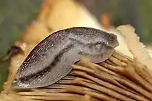 Like with other Arion species, the pneumostome lies in the anterior half of the mantle, and the back is round in cross-section rather than with a keel.[17][18] However, the subgenus Carinarion is distinguished by a row of paler tubercles along the midline of the back, giving the impression of a keel; this is less prominent in adults.[19] Another feature of Carinarion is that the cross-section is bell-shaped, with splayed-out rather than inward-curving sides.[20] The overall colour of A. circumscriptus is a monochrome dark grey (sometimes with a tinge of blue or brown), with a darker dorsal band and a darker lateral band along each side, the one on the right running above the pneumostome. The flanks below are paler. The sole is white or pale grey, and the mucus colourless, or sometimes pale yellow.[21][22] Length reaches 40 mm, or some say up to 50 mm.[21][19]