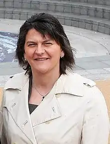 Arlene Isobel Foster, Baroness Foster of Aghadrumsee DBE, PC (née Kelly; born 17 July 1970),[2] is a British broadcaster and former politician from Northern Ireland who served as First Minister of Northern Ireland from 2016 to 2017 and from 2020 to 2021 and as Leader of the Democratic Unionist Party (DUP) from 2015 to 2021. She was the first woman to hold either position. Foster is a Member of the House of Lords, having previously been a Member of the Legislative Assembly (MLA) for Fermanagh and South Tyrone from 2003 to 2021.