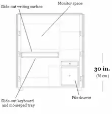 The sketch of an armoire desk which comes with this article shows a fairly large version with four folding doors, a writing surface which slides out, and a keyboard and mouse pad tray which, in turn, slides out from under the sliding writing surface. In the version shown here it is possible to leave a few thin piles of paper on the writing surface before sliding it back in. In other versions this is not possible. Since most armoire desk are modern forms, the writing surface here is placed at 30 inches (76 cm) from the floor. In antique desk forms it would have been 29 inches (73.5 cm) from the floor.