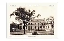 The mansion was designed by the architect Henrik Wallin (1873-1936) in 1917 in an Italian Renaissance Revival style with interior elements of various established and experimental styles. The ten-bedroom home has nearly 26,000 square feet of living area. It is three stories over a full garden level with Granite balustraded terraces at each level. A broad hemicycle colonnade extending toward Bull Street offers a prospect of Forsyth Park. Other design features include a porte-cochère that opens into a side garden, an orangery, loggia, and sunporch. Exterior materials are granite and glazed brick. Bronze entry doors were fabricated by Bonachek of New York, with other doors in steel with bronze hardware. Windows were fabricated of steel and bronze by International Casement Company, now Hope Windows, which features the home in their promotional materials.[4][5][6]