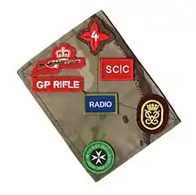 The primary weapon of the cadet forces is the L98A2 Cadet GP Rifle[27] this is a cadet specific version of the British Armed Forces' L85A2 SA80 which has been adapted to fire only on repetition (semi-automatic) and therefore does not have a change lever, the weapon system is chambered in the NATO 5.56x45mm cartridge. In order to become proficient in this weapon system and pass the one-star Skill at Arms (SAA) test, cadets must show they can handle the weapon safely, perform stoppage drills, and field strip the weapon for daily cleaning, in addition to passing one-star Skill at Arms the cadet also receives a Weapon Handling Test (WHT) pass which must be re-qualified every 6 months.[28] Once a cadet has an in date WHT, cadets can fire the weapon using blank rounds in field exercises using the Safe Blank Firing System (SBFS) and with live rounds on a range possibly gaining marksman qualification badges based on their accuracy. There is also a non-firing training version of the GP Rifle, the L103A2 DP (Drill Purpose), this is generally used for teaching cadets the basics of the weapon they are handling and for rifle drill. The L98A2 Cadet GP Rifle is also capable of being fitted with the British Army L41A1 sub-calibre adaptor which enables the weapon to fire .22 rimfire ammunition.