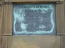 In 1858 Forwood married Lucy, daughter of Simon Crosfield (brother of the businessman Joseph Crosfield), of Liverpool; they had three daughters. Lucy died in 1873, and the following year Forwood married Mary Anne Eliza, daughter of the journalist and historian Thomas Baines, FRS, of Liverpool and of London. They had four sons (the eldest, Dudley, being heir to the baronetcy), and a daughter.[5][6] Forwood died in September 1898 at his home, The Priory, Gateacre, Liverpool and was buried nearby in the graveyard of All Saints Church, Childwall. He had been suffering from colitis, and this led to heart failure. Forwood's estate amounted to a little over £87,320[1] (£10.4 million as of 2023).[7] His statue stands in St John's Gardens, Liverpool.[8]