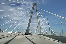 The Arthur Ravenel Jr. Bridge (also known as the Ravenel Bridge and the Cooper River Bridge[3]) is a cable-stayed bridge over the Cooper River in South Carolina, US, connecting downtown Charleston to Mount Pleasant. The bridge has a main span of 1,546 feet (471 m), the third longest among cable-stayed bridges in the Western Hemisphere. It was built using the design–build method and was designed by Parsons Brinckerhoff.